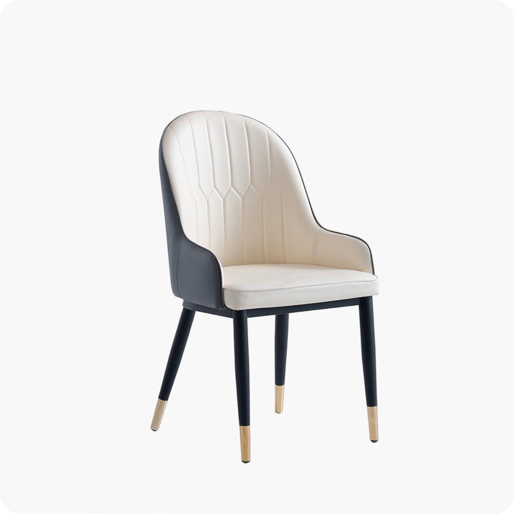The Desk One KnitForm chair combines elegance and comfort with its soft ivory knit-textured upholstery and sleek black legs finished with gold tips. Perfect for adding a refined touch to any dining or reception space.