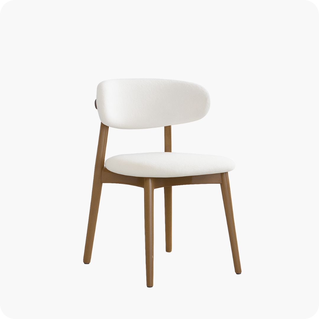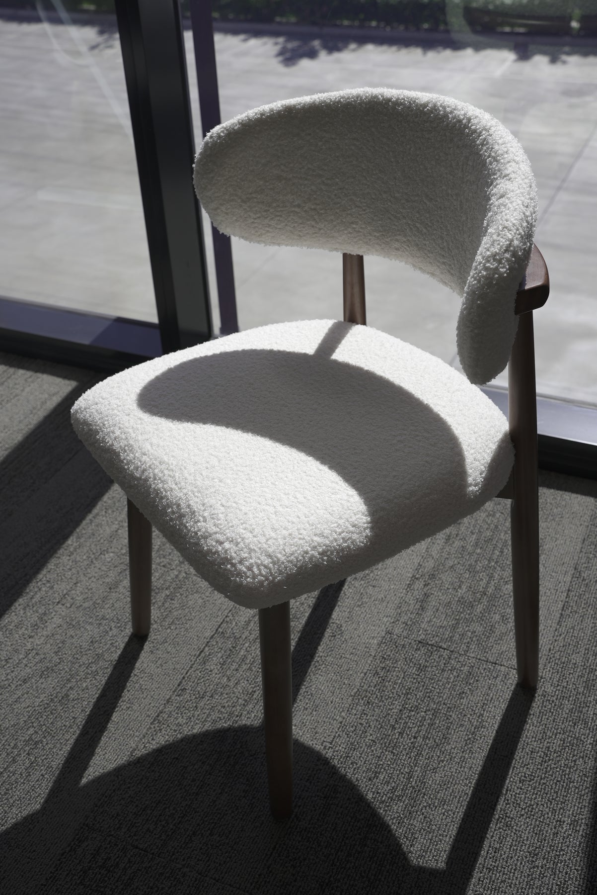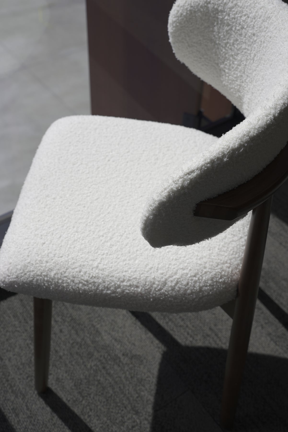 The Desk One Dante Chair blends mid-century charm with modern sophistication. Crafted from solid ash wood and upholstered in soft white boucle fabric, it delivers both visual warmth and exceptional comfort. Its elegant curves and clean lines bring a refined yet cozy aesthetic to any space — perfect for dining areas, lounges, or stylish home offices.