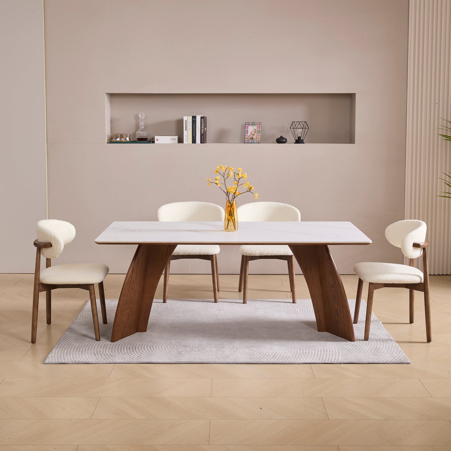 The curved solid wood base introduces a sense of movement and visual softness while maintaining excellent stability. Designed as a statement piece, the ArcoStone Dining Table elevates modern interiors with its light luxury presence and refined craftsmanship.