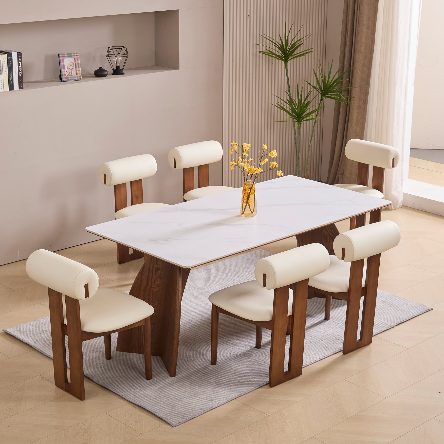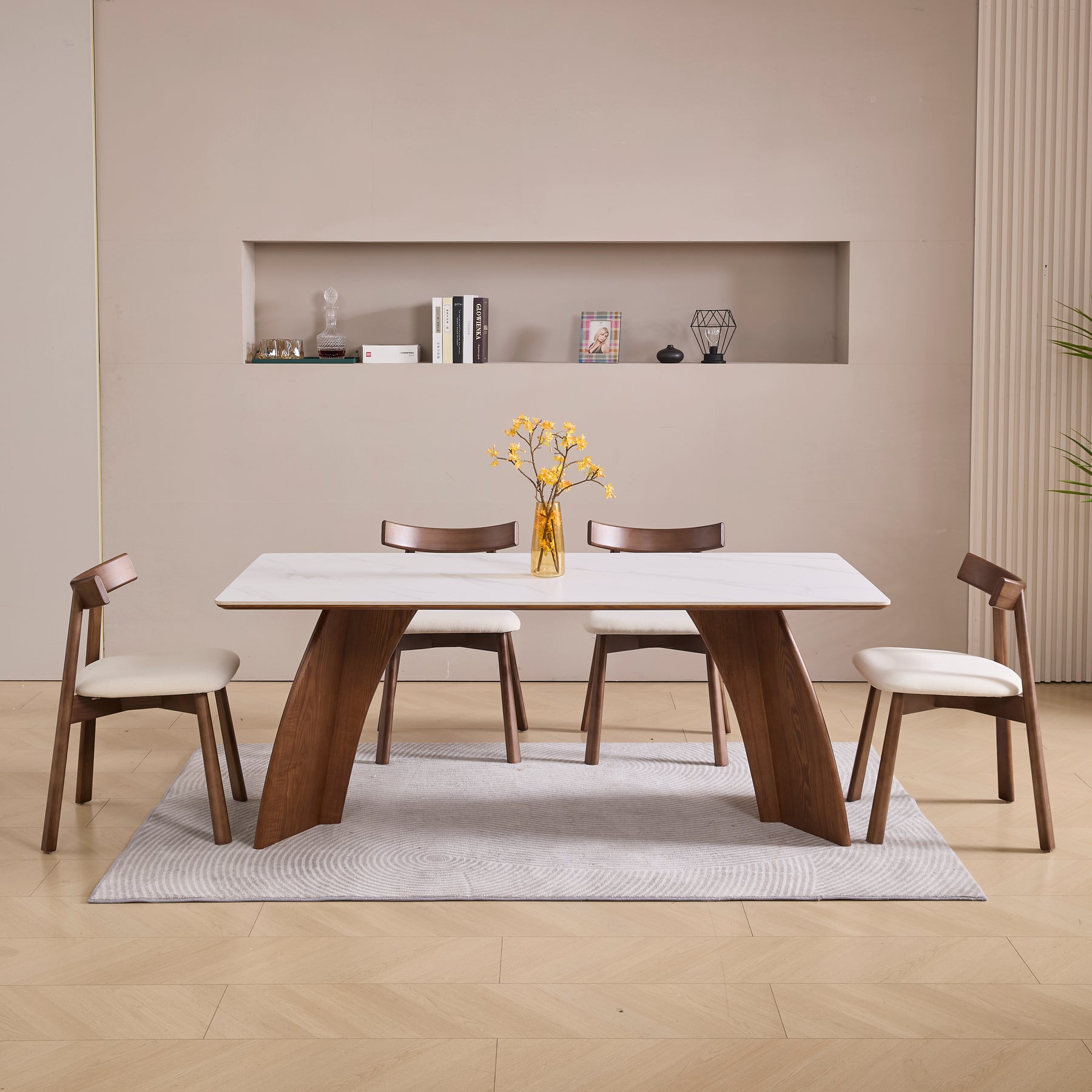 The DeskOne Arco Dining Table features a refined white marble-look stone tabletop paired with sculptural solid wood legs, creating a striking balance of elegance and architectural form. The smooth stone surface is durable, scratch-resistant, and easy to clean, making it ideal for both everyday dining and special gatherings.