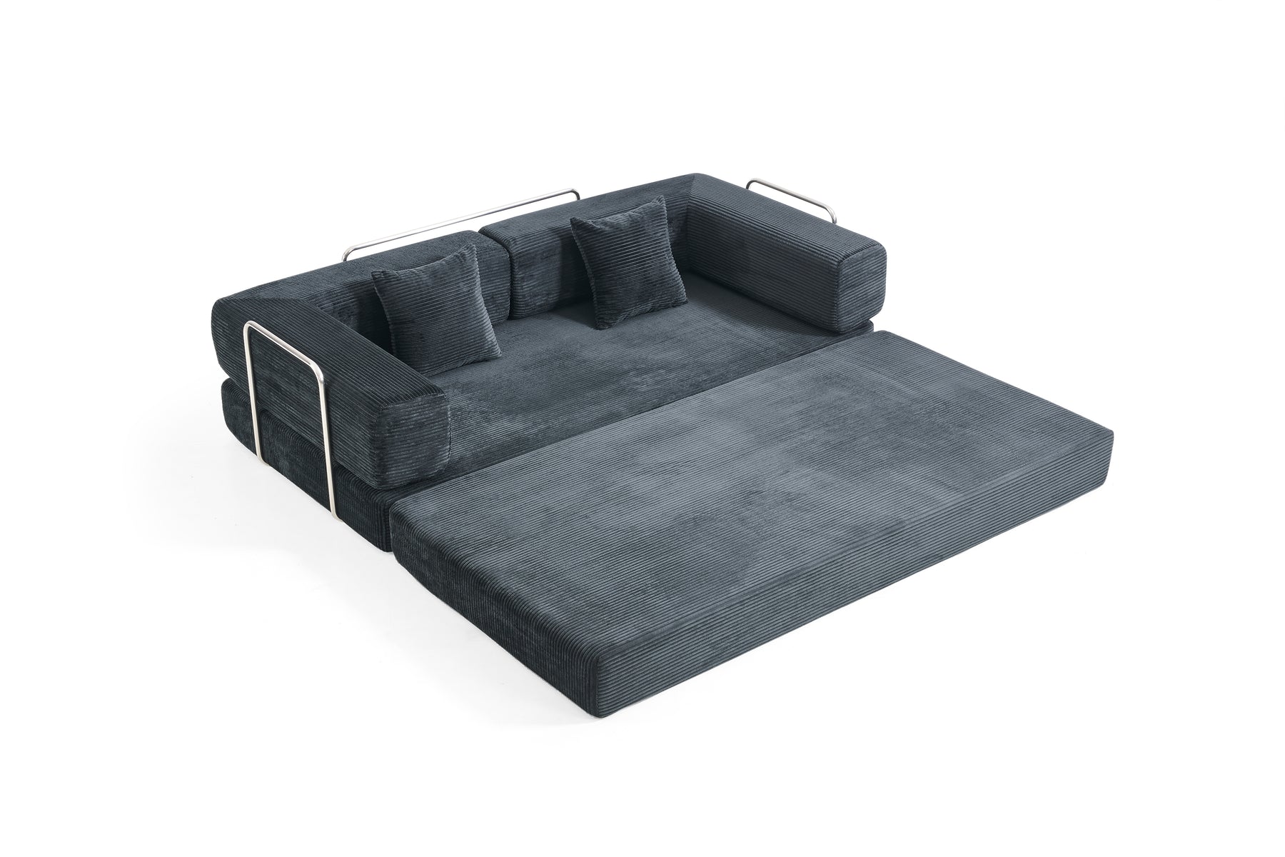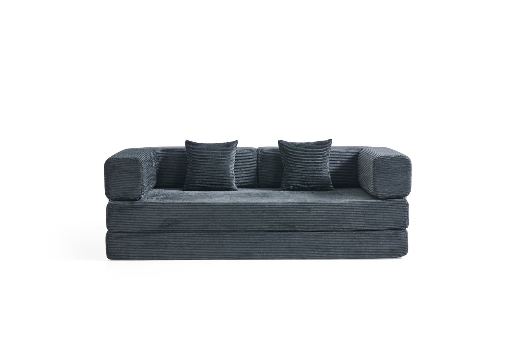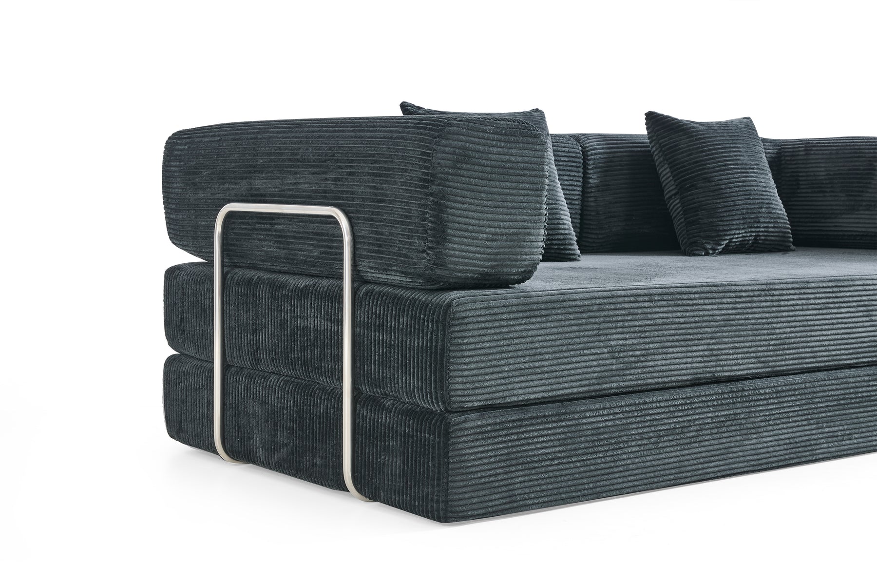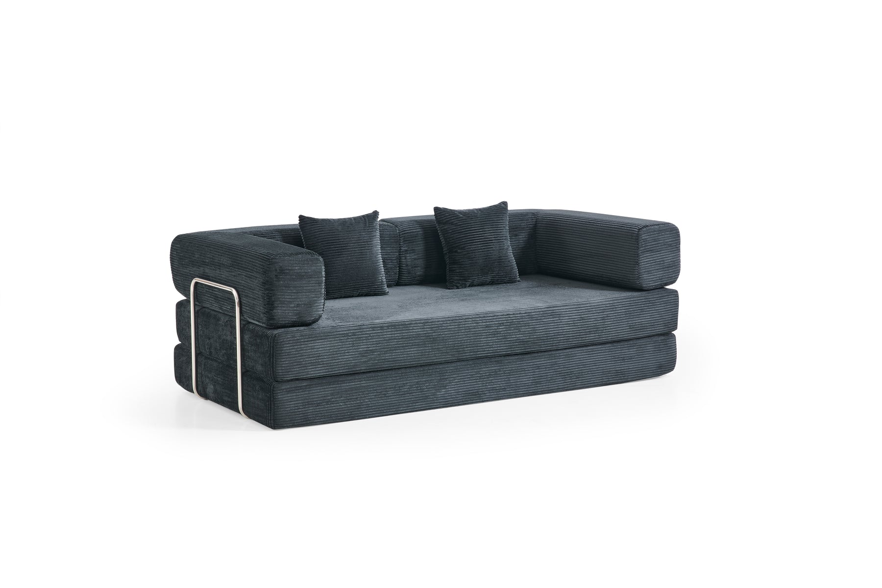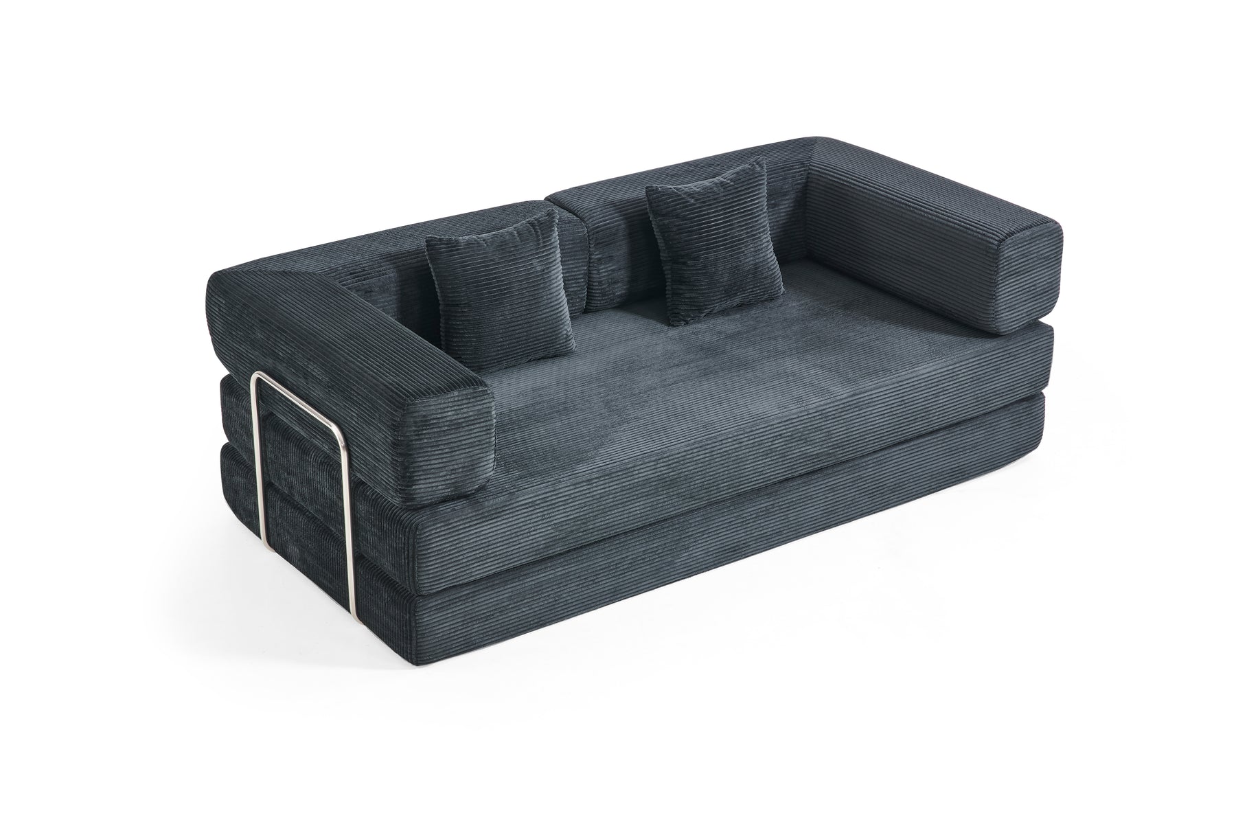 Crafted with high-density foam, FoldFlex delivers durable support without sacrificing softness. The ribbed corduroy fabric adds tactile warmth and visual depth, while the integrated metal side handles allow smooth expansion. Paired with two matching cushions, it brings both relaxation and structure into your space.