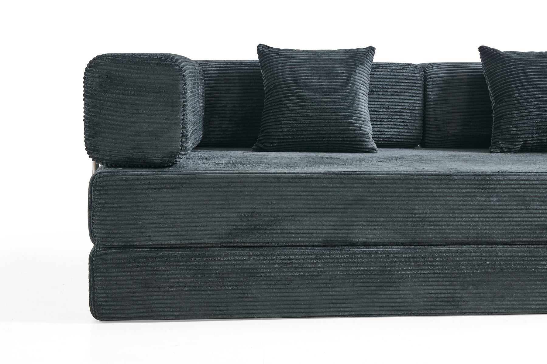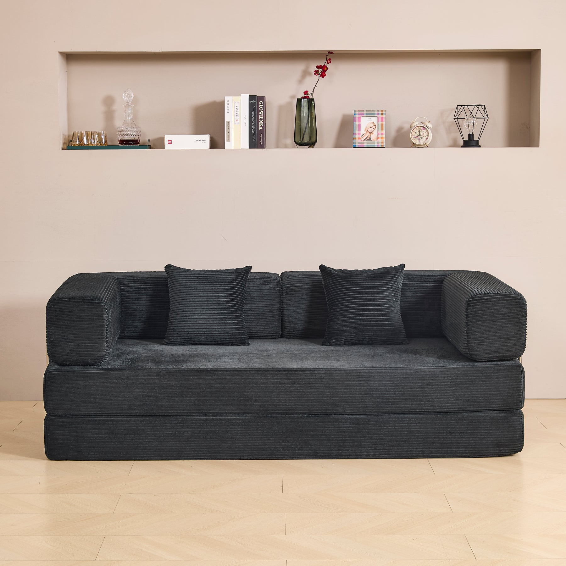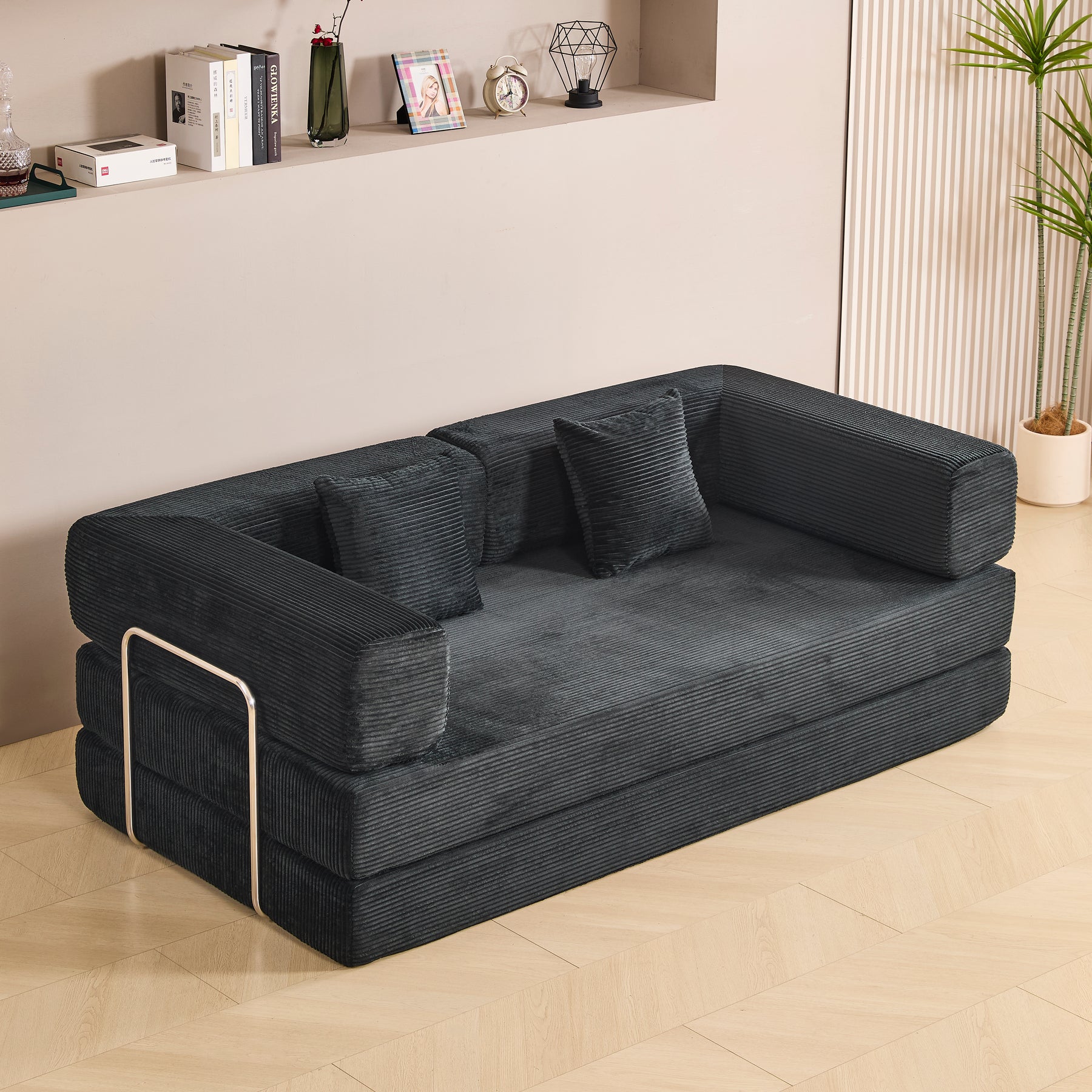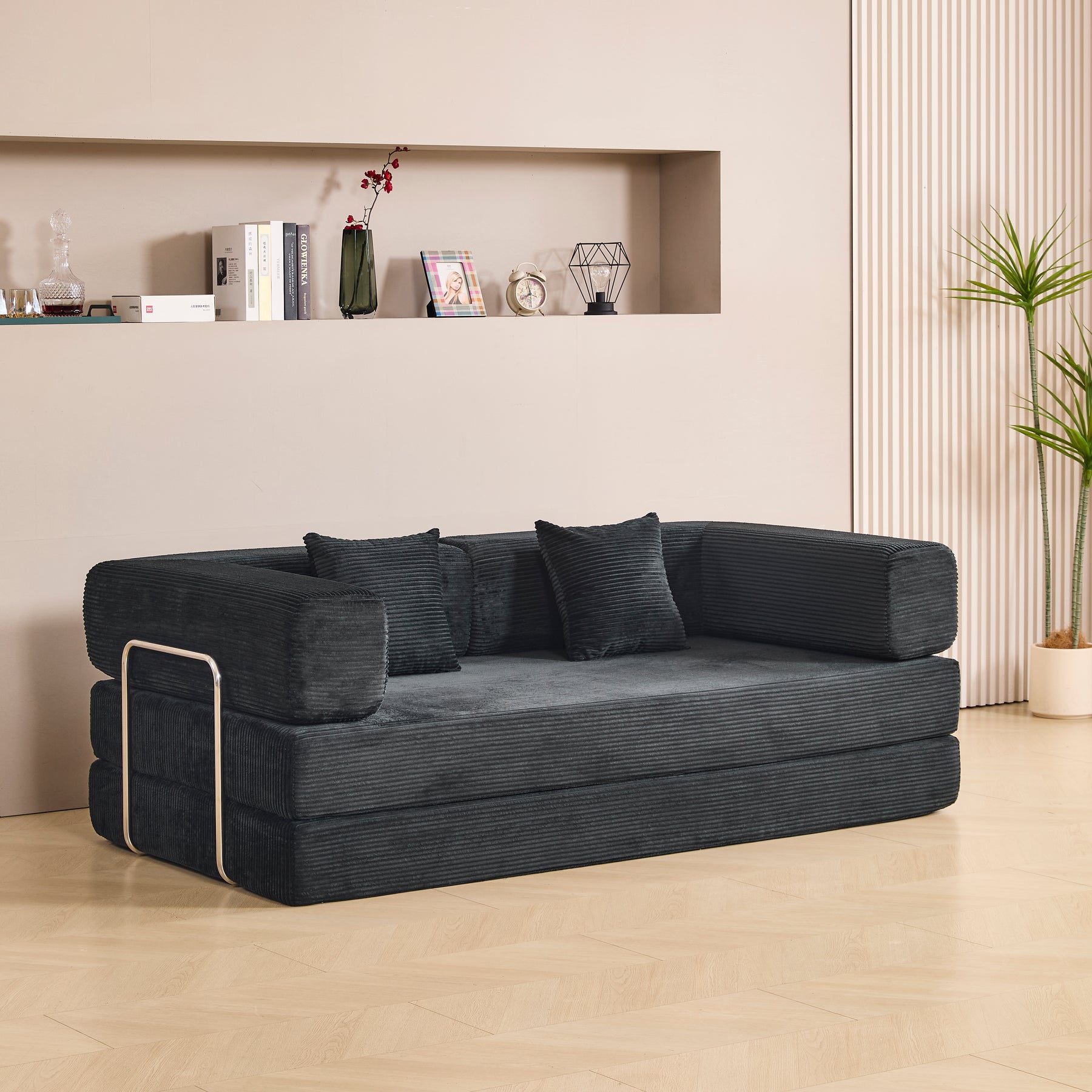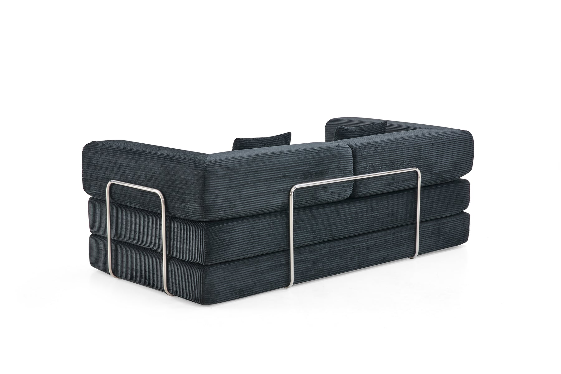 Crafted with high-density foam, FoldFlex delivers durable support without sacrificing softness. The ribbed corduroy fabric adds tactile warmth and visual depth, while the integrated metal side handles allow smooth expansion. Paired with two matching cushions, it brings both relaxation and structure into your space.